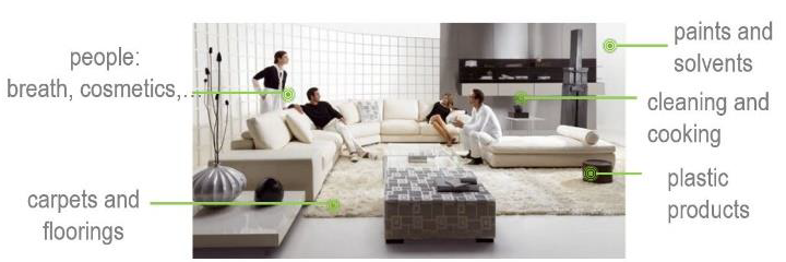 Στους εσωτερικούς χώρους1έχουμε έκριση οργανικών ουσιών (volatile organic compounds). Μερικά είναι επιβλαβή από μόνα τους, συμπεριλαμβανομένων ορισμένων που προκαλούν καρκίνο. Επιπλέον, μερικά μπορούν να αντιδράσουν με άλλα αέρια και να σχηματίσουν άλλους ατμοσφαιρικούς ρύπους αφού βρεθούν στον αέρα. Αυτά συνήθως είναι καθαριστικά, χρώματα, εκτυπωτές, χαρτί κτλ